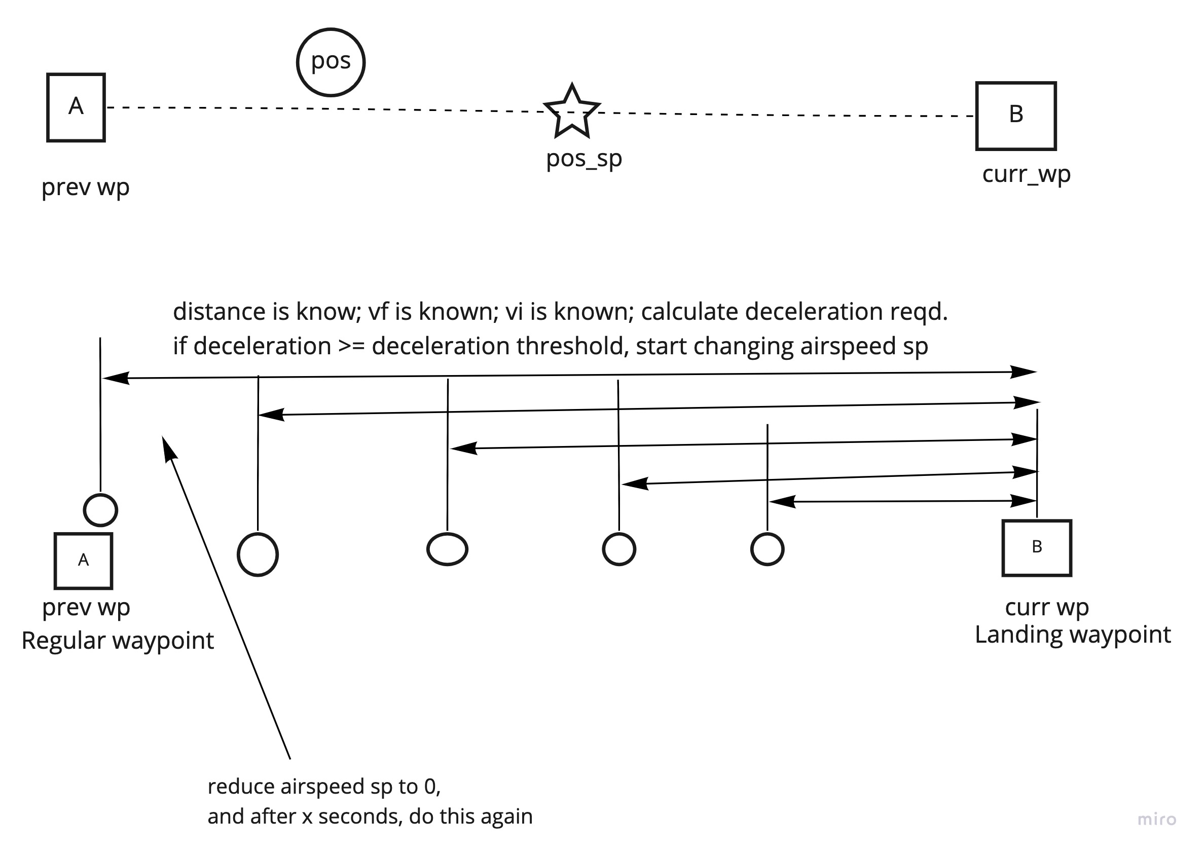 First, we focused on the slow down maneuver. Since the plane can’t slow down past 13 m/s without stalling in fixed-wing mode, that was our target speed. Once the plane’s navigation set-point was in range of the landing waypoint, the plane would pitch up immediately. This would force the plane to stall and lose the majority of its speed and go into VTOL mode. Pitching up would result in a change in altitude within ±5 meters and slow the plane to a stop.